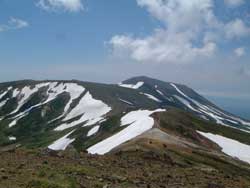 | 北鎮岳分岐から黒岳へと下る 夏の初めとあって残雪が多かった 展望台でお鉢平と別れを告げた後 のびやかな雲ノ平の高原をぶらぶら歩き黒岳石室まで行く |