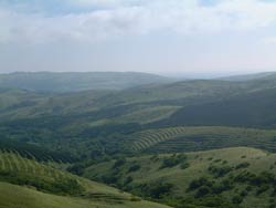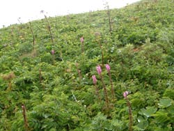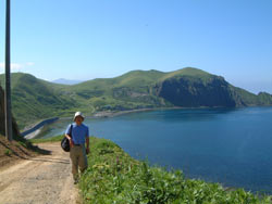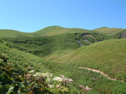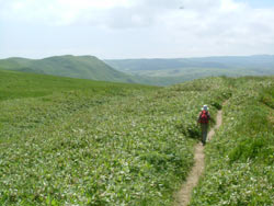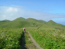 | アワビコタンの海岸からゴロタ山への登りにかかる ここらは本格的なお花畑で、ヨツバシオガマ、ツリガネニンジン等の咲く草原をのんびり歩いて最高に気持ち好い。 |