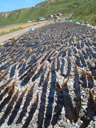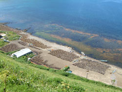 | 須古頓(スコトン)の部落をすぎて、鮑古丹(アワビコタン)の海岸へ降りる。海岸いっぱいにコンブが干してある。 コンブはすばやく乾燥させないと質が落ちてしまうそうだ |