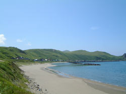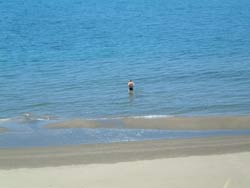 | 花の咲き乱れる草原を下って、ゴロタノ浜にでる。 砂浜のきれいな海岸で 人っこひとり見えない。 稔 いきなり裸になって海に飛び込む。気分は最高 |