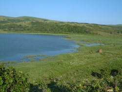 | 澄海岬からは 西上泊分岐まで登って、草原のなかを浜中まで歩く。 浜中の部落で 民宿 ゆうなぎ(今日の宿)の場所を尋ねたら、おばさんが車で送ってくれた。 本当に親切! 2時半 船泊(フナドマリ)の海岸に面した宿に落ち着いた。 夕方まで海で遊び、近くの久種湖を一周したりしてすごす。 |