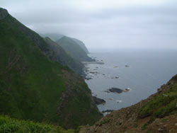 | ちいさい峠を越えると山道が開けて、いきなり崖の上に出た(9:45)。 あたり一面ガレ場。眼下に広がる切り立った岩とガスに煙る海原。昨日とは打って変わった厳しい景色をみながら休憩 |
