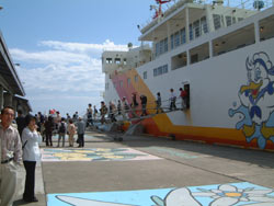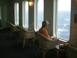 これから 新日本海フェリーに乗って 敦賀まで一日 船の旅をして、福井の三島宅に行くことになってる 苫小牧23:50発 敦賀へは翌日(7月17日)20:15到着 フェリーはすずらん、旅客定員507名 トラック122台乗用車80台とか。でも今日の乗船者は50人くらい。 どこもかしこもゆったりしている