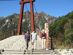 なにやら着物スタイルの新郎新婦が五千尺から出てきて、橋のたもとで写真撮影をしていた。 河童橋の上は大混雑。 私達も記念撮影。