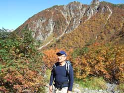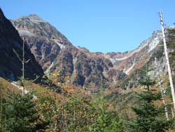 今日は天気もよく、紅葉も美しく、最高の景観だ。屏風岩を回り込むように 横尾谷に沿って歩く
