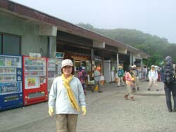 | 今日は上天気のはずだったが朝は不安定な雲行きで、牧ノ戸峠はガスに包まれて寒い。 休憩所は大勢の人でにぎわっていた。 ここから沓掛山第一展望台までは観光客も展望が楽しめるように舗装道が続いている。(残念ながらここも視界ゼロ) |