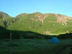 坊ガツルのキャンプ場はまだ山陰の中、法華院温泉と三俣山が朝日に輝いていた。