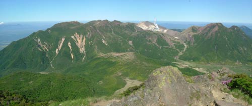 北に、ミヤマキリシマに縁取られた北大船山が美しく、南は間近に九重山群、遠くに阿蘇、由布岳、祖母山まで見える。