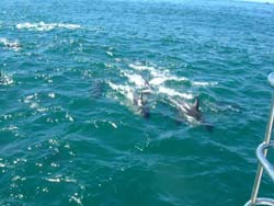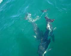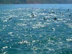 私達は船の上から眺める。イルカは遊び好きで、船と追いかけごっこをしたり、飛び跳ねたりして歓迎してくれる。なんともいえず魅力的だった。 |