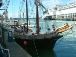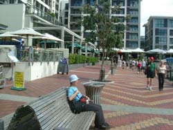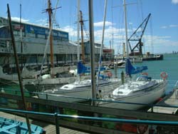 ここは、国際的なヨットレース アメリカズ・カップ に優勝した(2000年2月)チームの本拠地で、優勝を記念して造られたのだそうだ。港の前はカフェ・レストランが並んでいる。 |