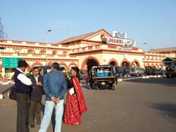 | 朝 5時45分 タクシーが迎えに来る。車の中で朝食代わりにバナナとオレンジを食べる。途中の村で飲んだチャイがおいしかった。ジャンシーまで3時間かかると言っていたが、早朝なので速く、8時には到着。デリー行きの列車は10時半発なので、レスト・ルームで休憩する。 20分前ホームに出て、列車を待てどくらせど、一向に来ない。ホームで売ってる弁当(成型した葉っぱの器にカレーとプーリー)を食べたら、以外とおいしかった。 30分遅れでやっと列車が到着したが、指定座席を探すのがこれまた大変。列車番号がわからないのだ。 列車は乗ってしまえば楽だが、とにかく乗るまでが疲れる。 |