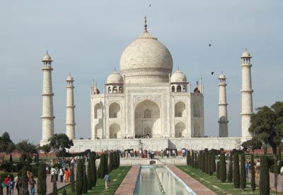 | タージマハルはムガル朝のシャー・ジャーハン帝が最愛の妻ムスターズ・マハルのために造った霊廟。1631年〜1653年の22年にわたる歳月を費やして完成した。 正面玄関の先はムガル式庭園がひろがり、コーランの天国の川を表す水路の先に4本のミナレットに囲まれたタージマハルが築かれている。霊廟の高さは66m。直径18m高さ26mの代ドームと、それを囲む4つの小ドームを載せている。内外の壁一面には、コーランの文字模様やチューリップ、ユリの花が刻まれ、窓にはすかし模様のスクリーンがはめこまれている。霊廟内には八角形の墓室があり、地下にはムスターズ・マハルとシャー・ジャーハン帝の棺がある。 |