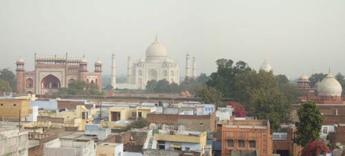 | 30分遅れで 2時半 アーグラー到着。 駅には昨日連絡をもらったという若い男がリキシャーを用意して待っていた。ナイキのTシャツを着て大きなバイクに乗って、22歳、学生と言っていたが、名前は忘れた。 タージマハル近くのホテル、シャンティ・ロッジの最上階の部屋に落ち着く。ネパール並みの安宿(竹本評)ではあるが、すぐ上が屋上展望レストランになっていてタージマハルの景色が素晴しく、気に入った。 |