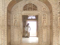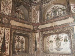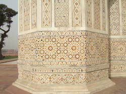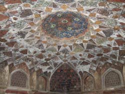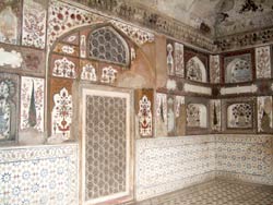 | イティマド・ウッダーラ廟は、ジャハンギール帝(アクバル帝の息子)の妃ムールジャハーンが、父親(時の宰相 ペルシャ人)のために、1622〜28年年に建てた廟。建物全体が大理石の象嵌で装飾され、窓に繊細な透かし彫りの枠が入っている。この技術は後のタージーマハルに受け継がれる。 内部は、大理石の象嵌の床、岩絵の具で描かれた花の壁、イスラム模様の天井、と極彩色の世界が広がる。 女性的で繊細な美しさが隅々まで行き渡り、イスラム文化の偏見を覆された。 |