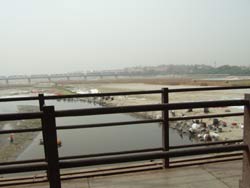 | 17時 リクシャーのおじさんが向かえに来た。ヤムナー河を渡って、夕日に映えるタージマハルを眺めに行く。 あいにくの曇り空で、景観は芳しくなかったが、行く途中、ヤムナー河にかかる橋の上の混雑ぶりが見ものだった。文字どうり、足の踏み場もない、とはこの事か・・・ |