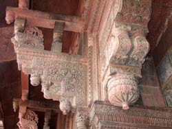 | ジャハンギール宮殿は、アクバル帝が息子と妃のために造ったと言われる宮殿で、ヒンドウトイスラムの建築様式が融合している。石柱の頭は木造組みの名残をとどめた装飾となっている。 | ||||||||||||||||||||||||||||||||||||||||||||||||||||||||||||