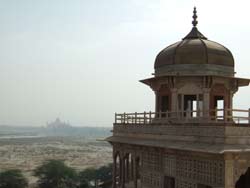 | 城砦に突き出た八角形の塔はムサンマン・ブルジ(囚われの塔)。 シャー・ジャハーン帝がつくった塔で、ヤムナー河から運ばれる涼風で涼しく、寝室として使われていたそうだが、後年、後継者争いで息子に幽閉された帝は愛妻が眠るタージ・マハルを見守りながら過したという。 現在は立ち入り禁止になっている。 |
