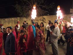 | バスは途中1回トイレ休憩をとって、ジャイプール 19時 到着。所要時間 約6時間 連絡が上手く行かず、ホテルの無料送迎を受けられなかった。バスを降りる場所を間違えたのか、よく分からないままにリキシャーでマドウバン・ホテルに行く。道中、あちこちで楽団がでて、はなやかなイルミネイションの中、着飾った人々が行列しているのに出会った。お祭りかと思ったら結婚式だとか。今日は日が良いので多いんだそうだ。 リキシャのおじさんが、明日500Rsで一日観光をしてくれるというので、頼む。 |