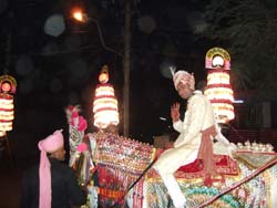 | マドウバン・ホテルはムスリム系の庭の美しいホテルだった。部屋も立派でうれしかった。 きれいなレストランで、チキンカレー、チーズカレー、チャパティ、チャイの夕食に満足する。料理を待っている間に、ホテルの前の通りを結婚式の行列が、楽隊の大音響とともに通っていった。レストランを抜け出して見学する。 |