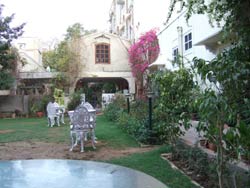 7時 庭で朝食(パン、目玉焼き、バナナとパパイヤ盛合わせ、チャイ)を食べる。手入れの行き届いた庭は静かで気持ちいい。大中小、3匹の犬が居て、庭の片隅にはウサギ小屋まである。不思議な感じ。インドに来て初めてペットと出会った。 | ||||||||||||||||||||||||||||||||||||||||||||||||||||||||
