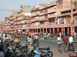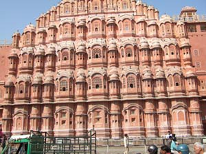| ジャイプルは、ラジャスターンの州都で、タール砂漠に近い乾燥地帯にあっる。人口200万を超える大都会だ。 1728年、この地のマハラジャ、ザン・シン2世が、丘の上のアンベール城から都を移して、この岩盤むき出しの山に囲まれた低地に新都を造った。それが、13kmの城壁と8つの門で囲まれた”ピンク・シティ”で、碁盤の目に広がる道路、びっしりと軒を並べる大きさもデザインもほぼ同一の商店、整然とした大通り、と驚くほどの計画的設計がされている。 バザール通りの建物はいずれもピンクがかったオレンジ色に塗られ、ピンク・シティと呼ばれているが、これは1883年イギリスのアルバート王子が来訪した際に、歓迎の意を表する伝統的なピンクに塗ったのが始まりだと言う。 |
