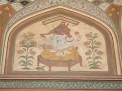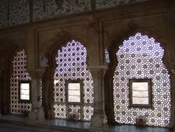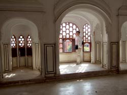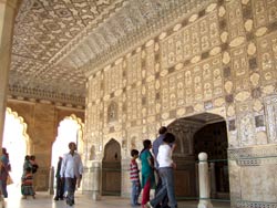 | おもむろにガーネイシャ門をくぐり、一般謁見の間、勝利の間(鏡の間)、歓喜の間 と見てまわる。鏡の間は壁から天井まで幾何学模様が鏡で張ってあって、見ものだ。まさにイスラムとラジャスターンの美しき結合といえる 鏡の間の隣は大きな居住空間で、下は池と幾何学模様の庭園になっている。歓喜の間では室内に流水を回して涼をとったとか。 建物の配置、通路は迷路のように入り組んでいる。敵の侵入を困難にするために通路はらくだ一頭が通れるだけの幅しかない。 |