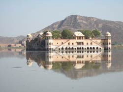 | 14時半 炎天下、歩いて城を下る。下の茶屋でおもわず、コーラを一気飲みする。 帰り道、水の宮殿の景観を楽しんだ。水の宮殿は湖に浮かぶ、マハラジャの夏用別荘として建てられた宮殿で、現在は立ち入り禁止。 大きな生地屋さんで、アンティークパッチワークの壁掛けを買う(140$)。すごい代物。 リクシャーのおじさんの誘いのままに、細密画家の養成所に行き、描いている所を見学した。分業制で、顔を描く人は顔ばかり描くらしい。記念に小さくて精巧な細密画を1枚買った(15$)。 |