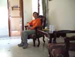 | 17時 ホテルに戻る。熱いお湯をポットにもらい、カップラーメンを食べた。おいしかったあ。(持っていった湯沸かし器がこわれていてすごいショックだった) 今日から3階の天蓋つきベッドとバスタブ付きの部屋に移る。最高に気持ち良い。1600Rsの宿泊料は安い、と思った。玄関前は広いベランダになっていて、椅子とテーブルが置いてある。足元に蚊取り線香をおいて座り込むと風が心地よい。 |