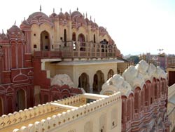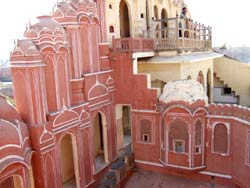 風の宮殿は 1799年サワイ・プラタープ・シンが建てた5階建ての建物。大通りに面した正面は大きいが、不思議なほど奥行きがない。テラスには幾何学的模様が施され、透かし彫りのスクリーンがはめこまれている。女性たちが姿を隠したまま、街を眺める為にされた工夫だが、同時に吹き込む風の温度を下げるクーラーの役目も果たしていた、と言う。テラスの中は信じられないくらい涼しかった。美しい建物。でも、女性が楽しむ為だけにこんな立派なものを建造したとは!!! | ||||||||||||||||||||||||||||||||||||||||||||||||||||||||