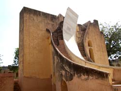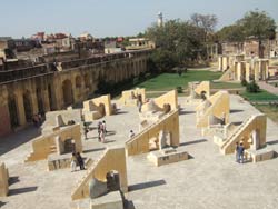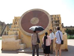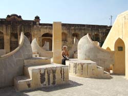 | 歩いて ジャンタル・マンタル に行く。 ジャンタル・マンタルは、1728〜1734年に作られた大規模な天文観測所。ジャイプルの街を築いたジャイ・スイン2世は天文学の造詣が深く、ムガル皇帝の許しを得て、デリーやバナーラス等、5箇所に天文観測所をつくったが、なかでもここが一番大きく、観測儀の数も多いそうだ。 |
