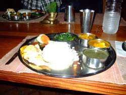 | トウルシ・ホテルは繁華街の真ん中にある、静かな、気持ちいいホテルで、門から玄関まで色とりどりの花が植えられているのが感じよかった。部屋は3階のバスタブ付きスペシャルルーム。今日は、青山さんと脇野さんが同室になる。 18:00 食事に出かける。 タカリキッチンで伝統的ネパール料理を食べた。おいしかった。横にいた日本人のおじさんが写真を撮ってくれた。 今日は疲れたのでお風呂もはいらず、そのまま寝る。 |