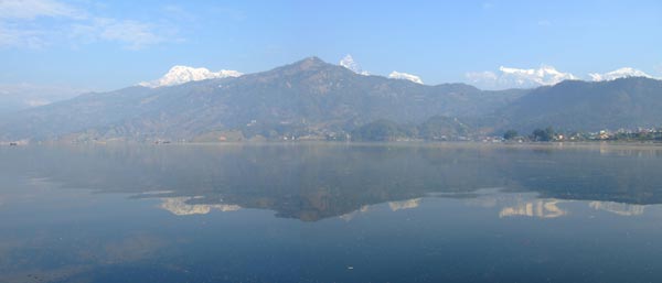 | 8:30 フェワ湖のボート乗り場に行く。ボートに乗って湖からアンナプルナを眺める。 水に映る姿がすごく美しい。 |