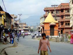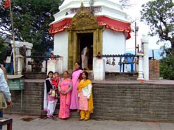 | 13:30 バクタさんとホテルで待ち合わせて、オールドタウンに連れてってもらった。 静かな町のたたずまいを見ながら歩く。宝石、貴金属の店が多いのには、やはりおどろく。 丘の上のビンドウバシニ寺院まで行った。本堂の中のドウルガー神はますます真赤だった。 |