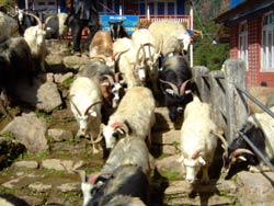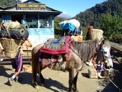 | 道は、森の中のおだやかな登りが続く。ウレリから黒犬がずっとついてきた。急斜面でヤクの群れを放牧していた。体のわりに角が長くて曲がりくねっている。 10:30 バンタンティBanthanti(2210m)でお茶休憩。青山さんは益々調子が悪くて、バクタさんがザックを持ってくれた。 バンタンティからはダラウンティ・コーラ沿いの山道。重要な交易路らしく、荷物を運ぶロバや馬の行列が多い。 |