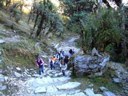 | デオラリからは小さな谷川沿いに下って、バンタンティBannThanntiに入る。また大きなしゃくなげの群生に出会う。 真赤に咲き誇るしゃくなげを見に、4月に来てみたい、と口ぐちにしゃべりながら歩いた。 |