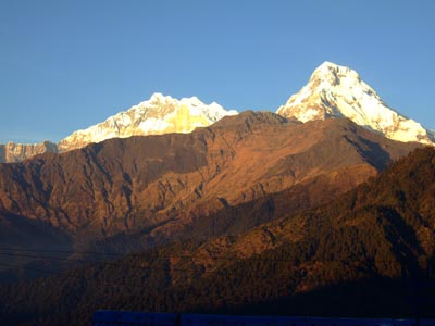 | 青山さんはすぐに寝る。明日、ブーンヒルに行けるかどうか、バクタさんが心配している。 脇野さんと食堂にお茶を飲みにいく。窓から、左にダウラギリ、右にアンナプルナが一望のもと。夕日に輝いている。うっとりと、あきずに眺める。 |