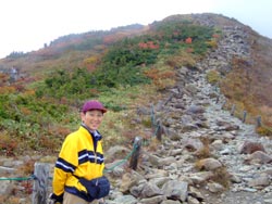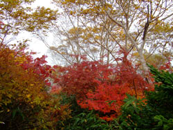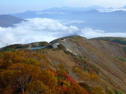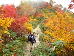 山荘の下は みずなら、ななかまど、つつじの紅葉が青々した笹と入り混じって、カラフルにすごくきれいだった。 |
