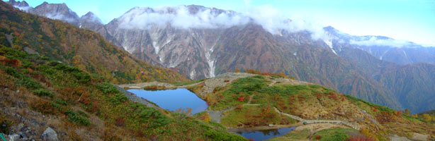 7:40 八方池着。池がうそみたいに青く、はい松の緑と紅葉のコントラストが美しい。池の西側に険しく荒々しい不帰の3峰がそそりたち、雲がちょっと邪魔してるとはいえ、天狗の頭から白馬岳までが一望された。東の彼方には戸隠から妙高、雨飾山までがくっきり見えて、しばし感激の溜息。 |