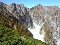 | しばらく登ると、二波に五竜岳と鹿島槍岳が見えてきた。ここからみる五竜岳は雄々しくて立派だ。 9:00 扇雪渓で休憩。はい松の丘に建つ丸山ケルン 9:30通過。不帰の峰はますます険しく、谷間の雪渓も近寄りがたさを強調している。 |