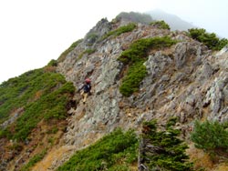 12:20 山荘を出発。山荘から見ると縦走路はガタガタのとがった岩山の連続で、いやな気分。少し行くとご親切に”ストックをしまってください”の注意書きがあった。案の定、切り立った岩場の連続で緊張の一時が続く。足がガクガクして写真を撮るどころではない。岩場に弱くなってる自分を自覚した。