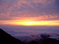 5:00起床 5:30朝食。食事中、朝日が上がり始めたので外へ飛び出した。白馬村の上の雲海を染めて、きれいなご来光を見ることができた。