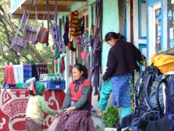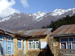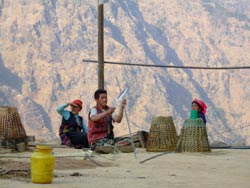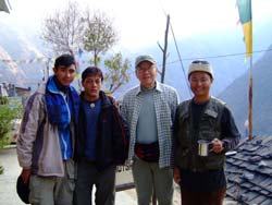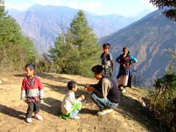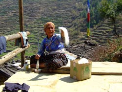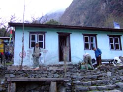 | 7:30 ポテトスープ、チャパティ、フライドエッグの朝食。 稔 絶食状態。 カトマンズまでのポーターガイドを紹介してもらう。 8:30 ミンマルさんという青年が来て、皆で条件を話し合う。4300Rsで決着。明朝迎えに来てくれることになった。ほっと安心して休息タイムに入る。その後、稔 インスタント粥を食べて元気になる。 玄関先でひなたぼっこをしながら、子供たちが遊ぶのを眺め、隣の売店で靴下を買う。カメラの充電もしてもらう。 |