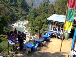 | 12:00 バンブー着。ランチ休憩の人々で大変な混みようで、ヌードルスープを頼んでから来るまで1時間もかかった。稔 2階の部屋で横になる。出発までぐっすり眠っていた。 天気良く、見晴らしのいい川沿いでのんびりする。風が冷たく、ダウンを着込む。 |