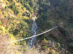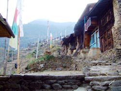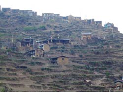 | 峠から谷川まで下って吊橋を渡り、登り返す。稔 益々歩くのが辛そうだ。 ツロ・シャンブルの村は山の斜面一帯に畑をつくり、頂上付近に家々が密集している。畑では主に麦と米、とうもろこしを作っているそうだ。 村に入ると細い石畳の道の両側に農家がたちならび、にわとりが歩きまわる石の庭で子供たちが遊んでいる。 |