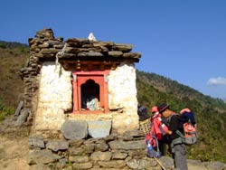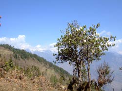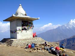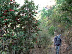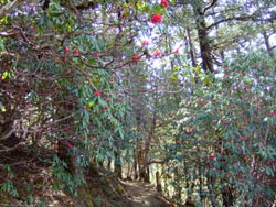 | 9:00 Dursagang(2720m)でお茶休憩。ひばりに似た小鳥の声がのどかだ。ゴサインクンダ方面の山々が輝いている。 道はまだまだ登り一辺倒。キャンジンゴンパから帰る日本人のヘリがしきりに飛んでいた。 10:30 ダンダ(3210m)到着。 ここからはなだらかな林の中の道になる。真っ赤に咲くしゃくなげの林があって、それはそれは美しかった。 |