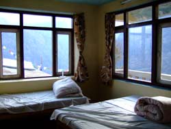 | 今日はトイレ・シャワー付き最高級の部屋。二方向に開けた窓からランタンリルンが美しく見える。電灯もつく。 ホットシャワーをあびて(4日ぶり)洗濯をして、気分爽快。 稔 ひたすら眠る。 バクタさんと相談して、私はトレッキングを続けるが、稔はカトマンズまで帰ることにする。夕食はポテトカレー。 |