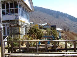 | 11:45 チャンダパリ(3210m)到着。風が強い。軒下につるした風鈴がしきりに鳴っている。ヌードルスープで昼食。 まわりの山は山火事で焼けたそうで、こげた木の根っこだけが一面に残っている。ラマホテルから一緒のおじさんとまたいっしょになった。 |