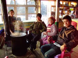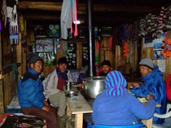 | 16:30 食堂のストーブにはりつく。 ポーターさん達は昼過ぎから食堂でトランプ博打。バクタさんは渋い顔。 |
