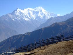 | 5:30起床 6:30朝食 7:30出発 朝の尾根道は気持ちいい。 ランタンリルンがきれいに見える。昨日の玉子売りが玉子を売りきって帰ってくるのと出会った。 |