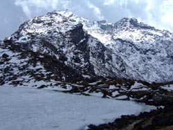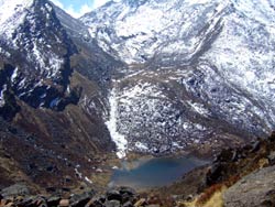 | 11:00 第一の湖 と出会う。真っ青な色をしている。山腹に険しい道が見える。祭りの時に村人が使うのだそうだ。 第二の湖は凍っていた。 ゴサインクンダには煩悩の数ほど(108)湖があるという。が、トレッキング中に出会うのは三つだけ。 |